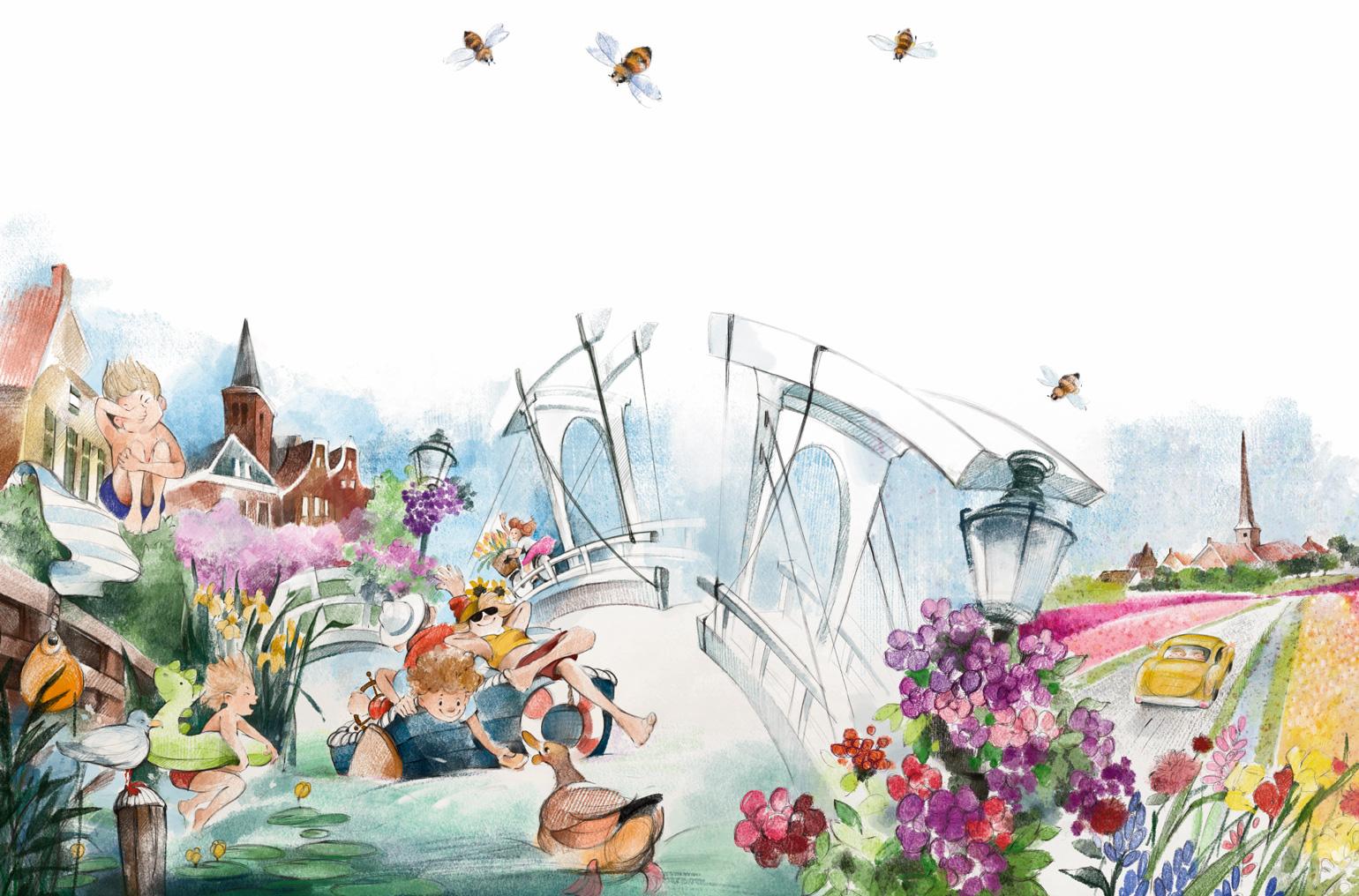 Наши мальчики как раз и жили в таком городе, маленьком-маленьком. Мама называла его деревней. Тут тоже были каналы, велосипеды и целые поля цветов. Цветы — ещё одно волшебство Голландии. Конечно, цветы есть и в твоей стране, и даже в твоём городе. Просто в Голландии их та-а-ак много, что иногда невозможно отвести взгляд от полей, проплывающих в окнах машины, которую ведёт папа.