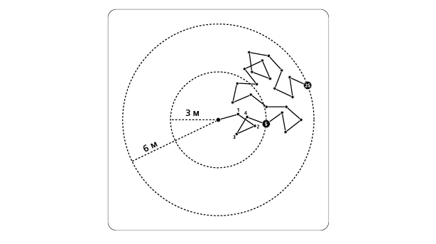 Рис. 2.1. Случайное блуждание иногда называют «прогулкой пьяницы», вызывая в воображении образ опьяневшего завсегдатая бара, который выходит за порог заведения, спотыкается на каждом шагу и падает, но каждый раз поднимается и бредет неизвестно куда. Для случайных блужданий характерен тот факт, что расстояние от изначальной точки возрастает пропорционально квадратному корню из числа шагов. В данном случае «клиент» находится в трех метрах от начала пути после 5 шагов и в 6 метрах от начала после 52 = 25 шагов