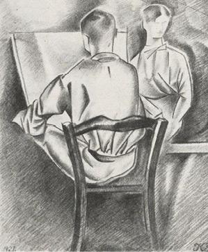 Николай Зарецкий. Владимир Бобрицкий за работой. 1921. Рисунок, вероятно, выполнен у Владимира Иванова. Из журнала Gebrauchsgraphik. 1926