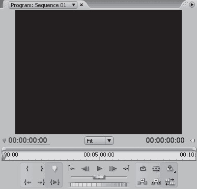 На экране Source (Источник) вы можете просмотреть клипы до помещения в последовательность, а также отредактировать их, обрезав лишние фрагменты (рис. 1.6). В данный момент в экран Source (Источник) клипы не загружены, поэтому элементы интерфейса этого окна неактивны.