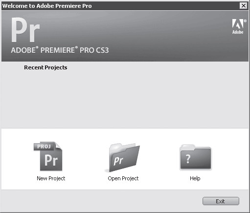 1. Нажмите кнопку Пуск и в появившемся главном меню выполните команду Все программы → Adobe Premiere Pro CS3. На экране появится заставка программы Premiere Pro, а затем – диалог с приглашением к началу работы (рис. 1.1).