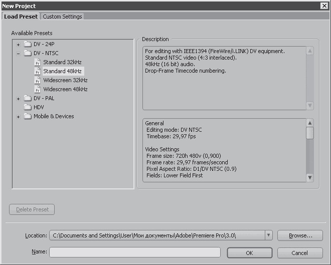 Вы выбрали заготовку Standard 48kHz из папки DV-PAL, так как стандарт PAL поддерживается большинством видеокамер и телевизоров. Стандарт NTSC распространен преимущественно в странах западного полушария и в Японии.