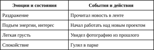 • Определи период для анализа (например, один день или неделя). Этот анализ удобнее будет сделать в виде таблицы из двух колонок: в 1-й колонке — «Эмоции и состояния», во 2-й — «События и действия».