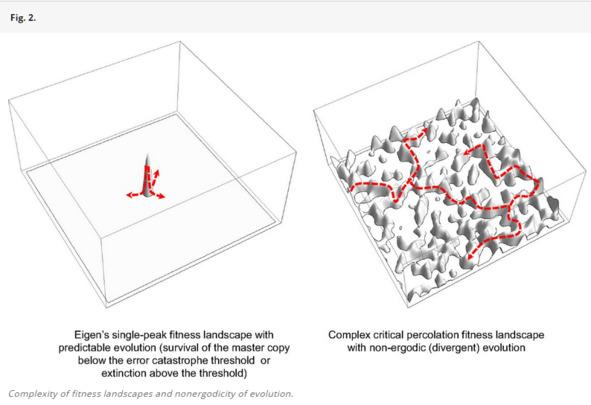 Она показывает, что у эволюционирующих систем в каком-то определённом смысле есть память (физики говорят про системы с памятью «не эргодические[12]», они не хаотично блуждают по всем своим состояниям), они запоминают конфигурацию «оптимума выживания». Но в реальной ситуации память не запоминает найденное конфигурационное решение намертво, ибо существует очень много разных конфигураций системы, у которых примерно одно и то же квазиоптимальное «соответствие нише»/fitness, между которыми очень маленькая разница в «оптимальности». Конечно, есть самые разные конфигурации систем, которые не смогут выжить, и их большинство, но и конфигураций, в которых системы выживут, предостаточно, и они очень мало отличаются друг от друга.