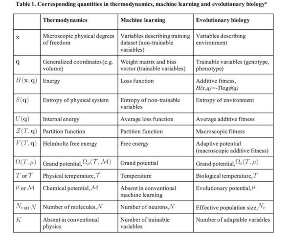 Посмотрите пример таблицы, которую сделали на базе сравнения похожести математических описаний в термодинамике, теории нейронных сетей (глубокое обучение/deep learning) в машинном обучении и теории эволюции[20]: