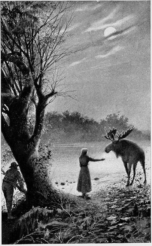 The lumberman gave neither a first nor a second thought to the loon at all, but quickened his pace in the cheerful open. The trail now led some way along the lake-side, till the shore became higher and rougher, and behind a cape of rock a bustling river emptied itself, carrying lines of foam and long ripples far out across the lake’s placidity. From the cape of rock towered a bleak, storm-whitened rampike, which had been a pine tree before the lightning smote it. Its broken top was just now serving as the perch of a white-headed eagle. The great bird bent fierce yellow eyes upon the stranger,—eyes with a cruel-looking, straight overhang of brow,—and stretched its flat-crowned, snake-like head far out to regard him. It opened the rending sickle of its beak and yelped at him—three times at deliberated interval. Then the traveller vanished again into the gloom of the wood, and the arrogant bird plumed himself upon a triumph.