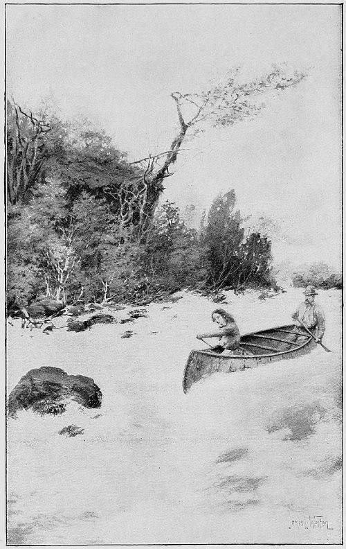 “Best fer ye to sit low, Mirandy, ’stead o’ kneelin’,” he explained, “coz I’ll be standin’ up, with the pole, goin’ through some o’ the rips, an’ ye’ll be steadier sittin’ than kneelin’.”