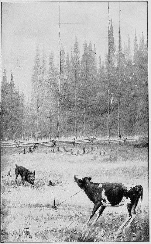 From the mossy crotch of an old ash tree, slanting over the trail, a pair of pale, yellow-green eyes, with fine black slits for pupils, watched the traveller’s march. They were set in a round, furry head, which was pressed flat to the branch and partly overhung it. The pointed, tufted ears lay flat back upon the round brown head. Into the bark of the branch four sets of razor-edged claws dug themselves venomously; for the wild-cat knew, perhaps through some occult communication from its far-off domesticated kin of hearth and door-sill, that in man he saw the one unvanquishable enemy to all the folk of the wood. He itched fiercely to drop upon the man’s bowed neck, just where it showed, red and defenceless, between the gaudy bundle and the rim of the brown hat. But the wild-cat, the lesser lynx, was heir to a ferocity well tempered with discretion, and the old lumberman slouched onward unharmed, all ignorant of that green gleam of hate playing upon his neck.