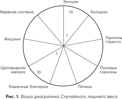 Концепция «Случайного лишнего веса», которая вначале существовала в виде бессистемных записей на странице, со временем превратилась в круговую диаграмму. Я использую ее в работе с клиентами, чтобы мы с ними могли определить те области, в которых им необходима помощь.