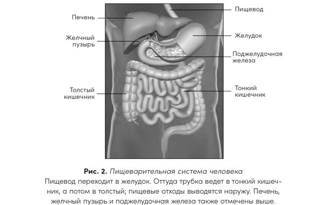 Пищеварительная система состоит из пищеварительного тракта — большой длинной трубки (можете представить себе нечто похожее на шланг) и множества вспомогательных органов, включая печень, желчный пузырь и поджелудочную железу (рис. 2 поможет вам понять, как все устроено). Эта длинная трубка начинается у вас во рту, откуда пища движется по пищеводу и через клапан попадает в желудок. Затем она проходит через клапан в нижней части желудка в тонкую кишку, через тонкую кишку и илеоцекальный клапан — в толстый кишечник, и в конце концов пищевые отходы выводятся из организма с противоположного конца пищеварительного тракта. Когда этот процесс налажен, вы выглядите и чувствуете себя великолепно. Но, если он нарушен, ситуация может быть прямо противоположной, и тогда, скорректировав его, вы в корне измените свою жизнь.