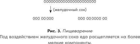 Пища попадает в желудок после того, как вы ее прожевали и проглотили. Запах еды, так же как и сам жевательный процесс, стимулирует выработку желудочного сока, который является исключительно важной составляющей пищеварения. Роль желудочного сока — расщеплять пищу. Представьте съеденную вами пищу в виде длинной связки колец, как показано в первом ряду на рис. 3. Задача желудочного сока состоит в том, чтобы раз, раз, раз — и покромсать эту связку колец на группы меньшего размера, как проиллюстрировано во втором ряду.