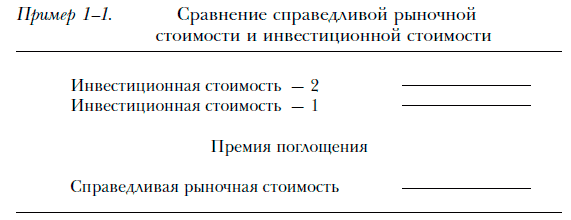 Различие между справедливой рыночной стоимостью и инвестиционной стоимостью представлено в примере 1-1, показывающем инвестиционную стоимость для двух потенциальных покупателей. Превышение инвестиционной стоимости над справедливой рыночной стоимостью компании обычно называется премией за контроль (control premium), но этот термин несколько вводит в заблуждение. Хотя типичный покупатель в результате поглощения действительно приобретает контроль над целью, смысл уплаченной премии состоит в достижении синергетического эффекта, создаваемого этой комбинацией. Таким образом, эту премию более правильно называть премией поглощения (acquisition premium), поскольку ее главной движущей силой являются синергии, а не контроль, представляющий собой лишь полномочия, необходимые для активизации синергии.