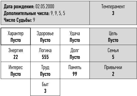 Например, моя мама («Энергия» 222222) – прекрасная хозяйка – требовала от меня («Энергия» 2) идеального порядка. Она искренне не понимала, что мне это трудно, но терпела (опять же благодаря энергии). Если бы она знала об анализе матрицы, то, восприняв мою уникальную природу, перестала бы требовать невозможное, а постаралась помочь мне научиться распоряжаться своим временем. Мой призыв к вам такой: если вы понимаете своих близких и не ждете от них того, что им не свойственно, вы не нервничаете, не злитесь, а значит, жизнь становится комфортнее, а вы – счастливее.