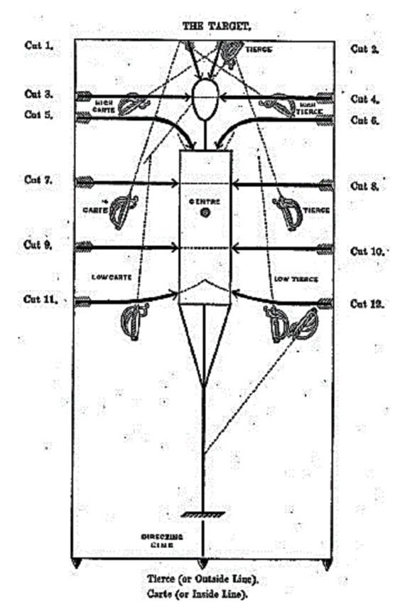 «Инструктор не должен переживать о том, чтобы солдат не применял силу из-за того, что слишком большое усилие может привести к ошибке при уколе. Незначительного укола штыком в тело (а я добавлю — и саблей) достаточно, чтобы вывести человека из строя, и многие неплохие молодые солдаты потеряли жизнь из-за того, что воткнув свое оружие в грудь врага слишком глубоко, не смогли его вовремя оттуда извлечь, чтобы встретить второго противника. Чтобы этого не произошло, укол острием должен быть выполнен быстро, с небольшим усилием, скорее как удар жала, а не укол, и сразу после этого штык должен быть столь же быстро извлечен». Фактически укол должен состоять из двух движений, выполняемых как можно быстрее. Это требует долгого обучения, поскольку обычный человек, особенно англичанин, выполнив укол, скорее всего останется в этом положении.