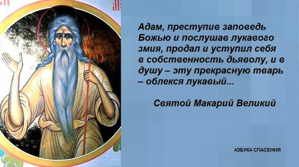 Но это обилие благодати не имело ничего приневоливающего. Человек был свободен быть с Богом и благодатью или отделиться от них. Он отделился и пал, как пали и духи. Послушав лукавого, Адам продал себя ему, а тот, завладев им, наполнил его всяким злом. Адам, преступив заповедь Божью и послушав лукавого змия, продал и уступил себя в собственность дьяволу, и в душу — эту прекрасную тварь — облекся лукавый.