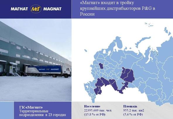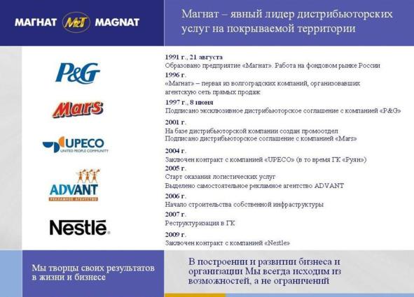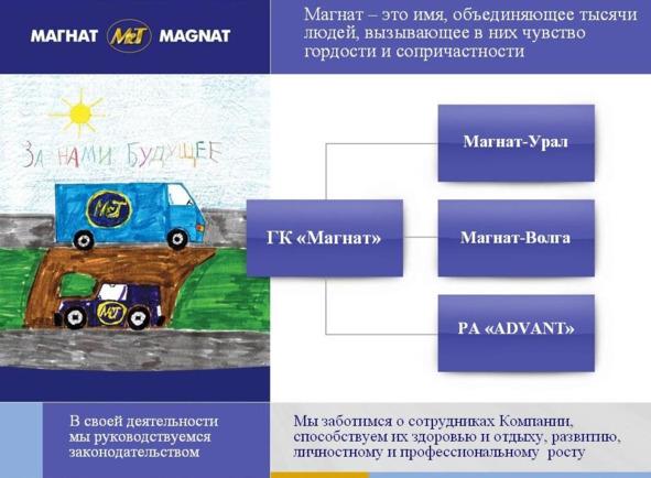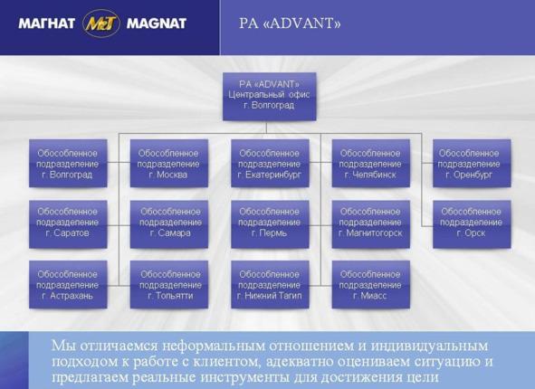 Сама группа компаний «Магнат» состоится из трёх значимых подразделений, которые генерируют доход (илл. 3): «Магнат-Урал» (илл. 5) и «Магнат-Волга» (илл. 4) ведут дистрибьюторский бизнес, рекламное агентство «ADVANT» (илл. 6), соответственно, дает рекламную поддержку. И всё это координируется головным офисом, который находится в Волгограде. Сама компания — российская.