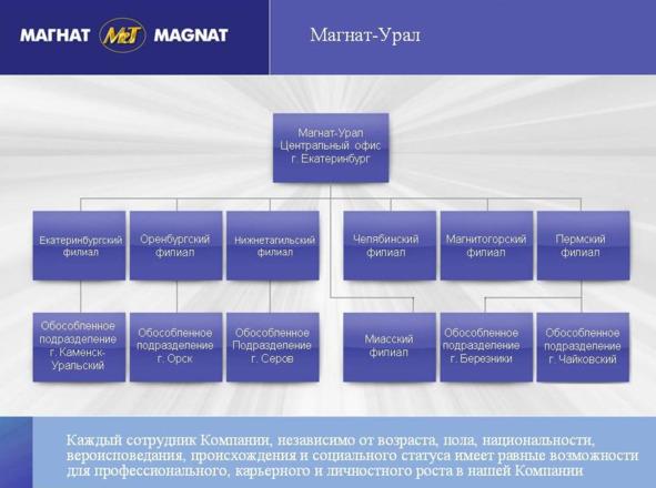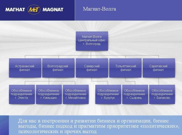 Далее на трёх слайдах показана структура нашей компании (илл. 4—6). Приведено, что на Волге у нас находится пять больших филиалов и несколько обособленных маленьких филиалов, они так и называются (обособленные филиалы). Центральный офис компании «Магнат-Волга» находится в Волгограде. Более значительная по территории — это компания «Магнат-Урал». Центральный офис находится в Екатеринбурге, приведены наши филиалы в Оренбурге, Нижнем Тагиле, Челябинске, Магнитогорске, Перми и Миассе.
