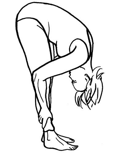 Завершая вдох, взгляните на руки и на выдохе наклонитесь вперед, стараясь как можно дольше удерживать спину прямой (рис. 19). Голова при этом остается между руками. Затем крепко возьмитесь руками за щиколотки, икры или колени и, чуть согнув локти, приблизьте торс к ногам (рис. 20). Подбородок прижмите к груди. Колени не сгибайте.