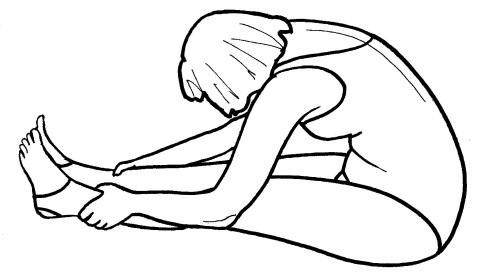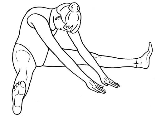 Если вам не удается согнуть локти, значит, вы чересчур низко ухватились за ноги. Переместите кисти выше и обязательно согните локти. Торс нужно притягивать к ногам при помощи рук, в противном случае вы рискуете перегрузить мышцы спины.
