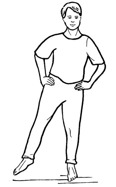 Теперь поднимите прямую ногу в сторону (рис. 8). Снова вернитесь в исходное положение. Повторите еще 2 раза. Наконец, отведите прямую ногу назад (рис. 9). Опустите ногу. Повторите еще 2 раза. Проделайте указанные движения другой ногой.