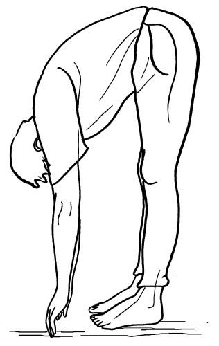 На выдохе нагнитесь вперед и по возможности дотроньтесь до пола пальцами. Колени при этом не сгибайте. Полностью нагнувшись, максимально расслабьте руки, шею и голову (рис. 11). Останьтесь в такой позе еще на 3 секунды, после чего вернитесь в исходное положение. Повторите еще 2 раза.