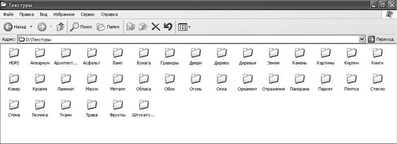 Необходимо также создать папку с названием Текстуры (или по-английски Maps), в которой следует хранить рассортированные по категориям текстуры. Так вам будет намного легче находить то, что нужно в настоящий момент, и не тратить время на поиск (рис. 1.1).