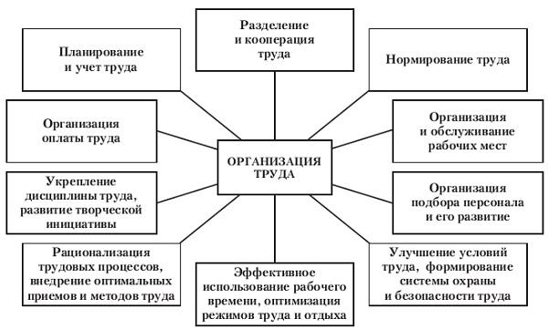 Порядок осуществления любого трудового процесса предполагает, во-первых, установление цели деятельности; во-вторых, установление перечня производственных операций и их последовательности; в-третьих, разделение всех видов работ между работниками и установление между ними системы взаимодействия, т. е. определенной кооперации труда; в-четвертых, приспособление рабочих мест для удобства работы; в-пятых, организацию обслуживания рабочих мест всякого рода вспомогательными работами; в-шестых, разработку рациональных приемов и методов труда; в-седьмых, установление норм труда и системы его оплаты. Для обеспечения соответствующей организации труда необходимы также создание на предприятии безопасных и здоровых условий труда, планирование и учет труда, воспитание дисциплины труда, подбор и подготовка кадров.