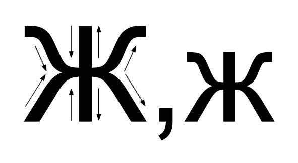 Поэтому и в графике написания этой буквы нет постоянной опоры, она стоит либо на одной опоре, а то и вообще на дуге, на дышле. Что же касается дышла, то, как известно, его «куда повернёшь, туда и вышло»!