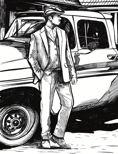 “Well, I get off there. Sure, I know you’re wettin’ your pants to know what I done. I ain’t a guy to let you down.” The high hum of the motor dulled and the song of the tires dropped in pitch. Joad got out his pint and took another short drink. The truck drifted to a stop where a dirt road opened at right angles to the highway. Joad got out and stood beside the cab window. The vertical exhaust pipe puttered up its barely visible blue smoke. Joad leaned toward the driver. “Homicide,” he said quickly. “That’s a big word — means I killed a guy. Seven years. I’m sprung in four for keepin’ my nose clean.”