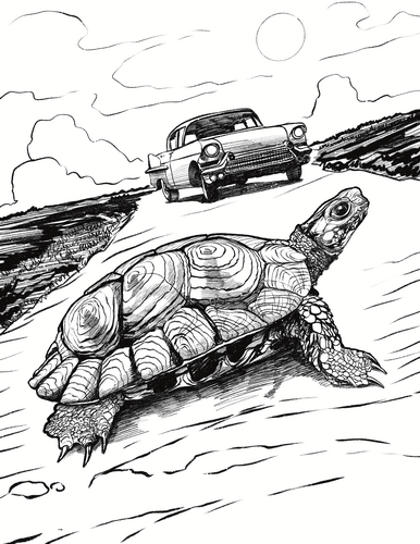Now the going was easy, and all the legs worked, and the shell boosted along, waggling from side to side. A sedan driven by a forty-year old woman approached. She saw the turtle and swung to the right, off the highway, the wheels screamed and a cloud of dust boiled up. Two wheels lifted for a moment and then settled. The car skidded back onto the road, and went on, but more slowly. The turtle had jerked into its shell, but now it hurried on, for the highway was burning hot.