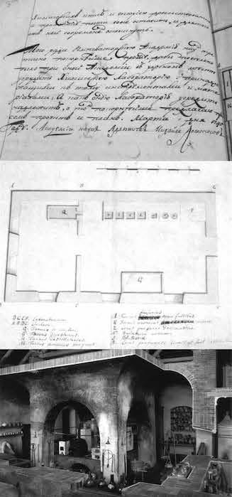 Прошение М. В. Ломоносова об учреждении химической лаборатории, начертанный им план и фото помещения