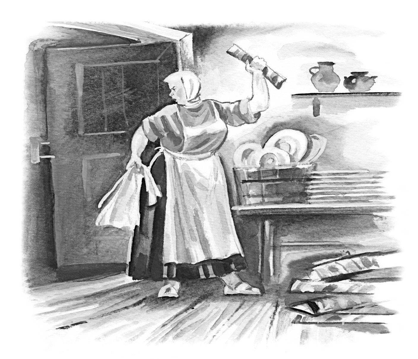 На большом некрашеном столе в беспорядке валяются грязные тарелки. Горничная Таня, молодая девушка с длинной, ещё не чёсанной косой, торопливо обгладывает какую-то вчерашнюю холодную кость. Еремей в углу молча возится с концами упряжных ремней, бесконечно налаживая и пригоняя конец к концу, собираясь сшивать их приготовленными шилом и дратвой. Его жена, Настасья, толстая и грязная судомойка, громко и сердито перемывает тарелки, энергично хватая их со дна дымящейся тёплой лоханки. Вытертые тарелки с шумом летят на рядом стоящую скамью. Рукава Настасьи засучены; здоровое белое тело на руках трясётся при всяком её движении, губы плотно сжаты, глаза сосредоточенны и мечут искры.
