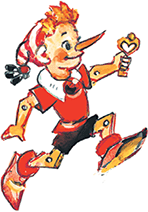 Увидев бегущего деревянного человечка, он широко расставил ноги, загородив всю улицу. Буратино хотел проскочить у него между ног, но полицейский схватил его за нос и так держал, покуда не подоспел папа Карло…