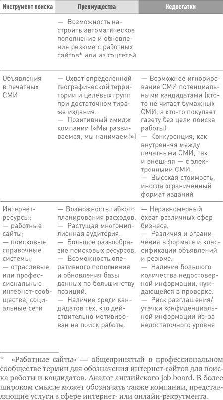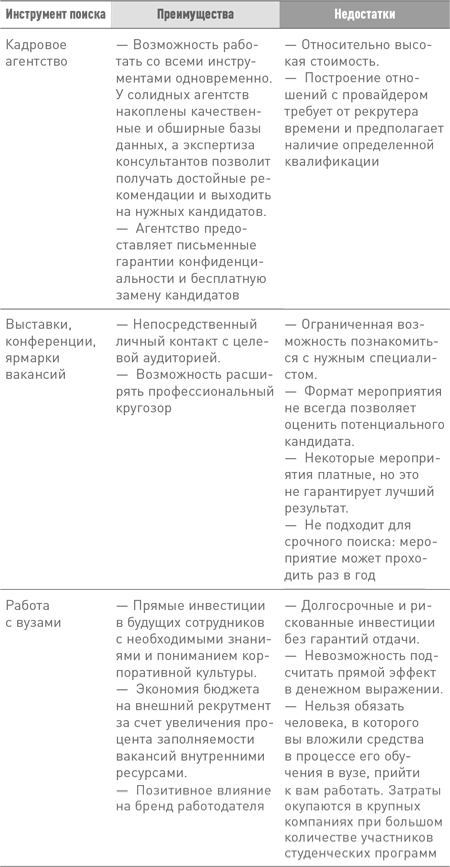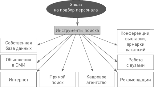 Основными инструментами поиска для рекрутера являются: собственная база данных потенциальных кандидатов, интернет-ресурсы, прямой поиск, поиск через рекомендации, работа с вузами с целью привлечения лучших студентов и выпускников, а также поиск через профессиональное агентство по подбору персонала. Со временем вы наверняка сможете вспомнить конкретных кандидатов, с которыми встречались ранее, и тем самым ускорите свой новый поиск. Вы можете также обратиться к коллегам или знакомым, являющимся экспертами в искомой области. Зачастую и сам линейный руководитель, будучи профессионалом в своей сфере, подскажет вам имена потенциальных кандидатов либо компаний, в которых такой человек может работать. С кем-то из потенциальных кандидатов вы можете познакомиться в социальных сетях, а также на публичных мероприятиях.
