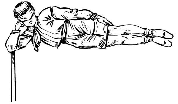 Он вынес на середину сцены стойку, состоящую из нижней доски и укрепленной в ней отвесно палки, примерно в рост человека. Пододвинув к палке стул, он знаком приказал мальчику опереться правой рукой о верхний конец палки, достал еще одну палку, подставил ее под левую руку, а под ноги – стул. Мальчик повис в воздухе, опираясь на три точки: две палки и стул.