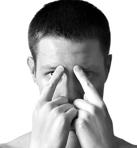 Используются специальные симметричные точки, расположенные на 1,5 пальца ниже нижнего века и на 1 палец по бокам от крыльев носа. Сядьте спокойно, уприте подбородок в большие пальцы, а указательными пальцами обеих рук синхронно с умеренным усилием давите на точки (фото 5). Необходимо выполнить 64 круговых надавливания (направление вращения – в противоположные от носа стороны).