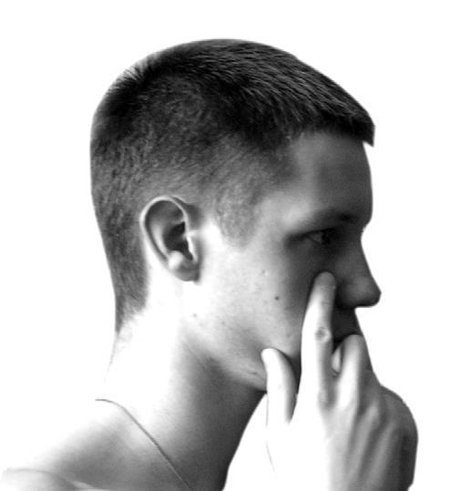 Используются симметричные гармонизирующие точки над внутренними концами бровей (фото 1). Затем прикройте глаза и массируйте симметричные возбуждающие точки у наружных уголков глаз (фото 2). Затем симметричные успокаивающие точки под глазами, по ходу гайморовых пазух (выступающие кости лица – фото 3). Затем симметричные специальные точки у крыльев носа (фото 4).