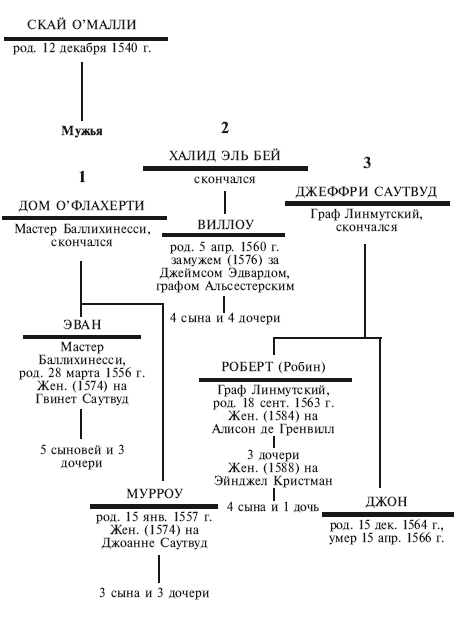 Конечно, брак кончился катастрофой. Найл безумно любил Скай О’Малли, тогда еще жену О’Флахерти из Баллихинесси, а когда она овдовела, он уже не в состоянии был скрывать это. Его брак был расторгнут дядей Скай, епископом Коннотским, и Дарра радостно устремилась в свой монастырь. Скай и Найл обручились, но судьба сыграла с ними злую шутку, снова разлучив их. Скай была пленена пиратами, потеряла память и перенесла немало бедствий, прежде чем они с Найлом снова увиделись. Но к этому времени она была женой другого, а прошлое стерлось из ее памяти – и Найл тоже. И у него была другая жена, несчастная Констанца, вскоре умершая. Но муж Скай, так любимый ею, тоже вскоре умер. К ней вернулись воспоминания о Найле, но теперь она была верна памяти Джеффри (за что ее уважал Мак-Уилльям). Да, это была замечательная женщина, и Мак-Уилльям глубоко сожалел о годах, потерянных ею и его сыном.