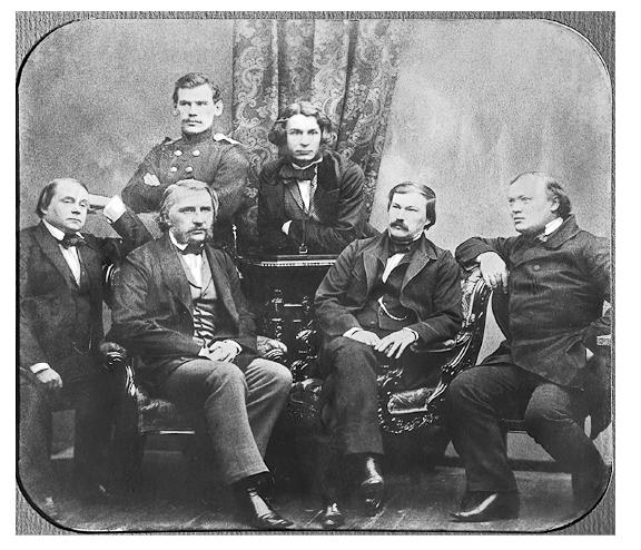 Групповой портрет писателей — членов редколлегии журнала «Современник». Во втором ряду: Лев Толстой и Дмитрий Григорович. Сидят: Иван Гончаров, Иван Тургенев, Александр Дружинин и Александр Островский. 1856 год. Фотография Сергея Левицкого {4}