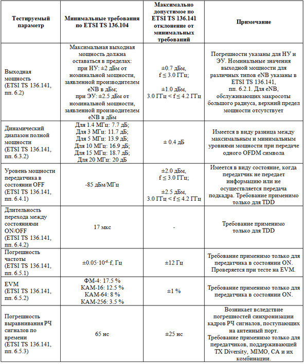 К тестируемым параметрам передатчиков относятся: выходная мощность, динамический диапазон полной мощности, уровень мощности передатчика в выключенном состоянии, время перехода передатчика между состояниями ON/OFF, погрешность частоты, величина вектора ошибки (EVM, Error Vector Magnitude), ошибка выравнивания радиочастотных сигналов по времени, мощность ресурсного элемента опорного символа в нисходящем канале, используемая ширина полосы частот, коэффициент утечки мощности в соседний канал, величина нежелательных излучений в рабочей полосе частот (band), величина побочных излучений и уровень интермодуляций. Тестируемые параметры, их номинальные значения и величины максимальных погрешностей для каждого вида теста передатчиков указаны в таблице 1.4.