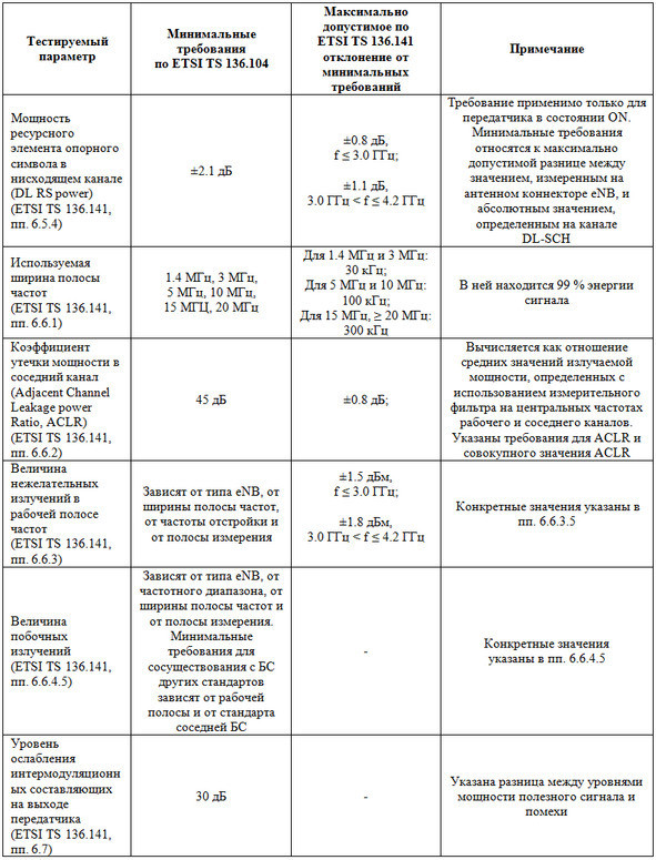При анализе методов тестирования параметров радиооборудования базовых станций следует учитывать, что некоторые требования, приведенные в ETSI TS 136.141, могут применяться только в определенных регионах, либо должны учитывать дополнительные условия, введенные соответствующим регулирующим органом. В пп. 4.3 данной спецификации описаны все подобные требования. Данные требования касаются следующих параметров: рабочие диапазоны частот, полоса частот одного радиоканала, положение радиоканала в рабочем диапазоне частот, максимальная выходная мощность базовой станции, величина нежелательных излучений в рабочей полосе частот и побочные излучения.