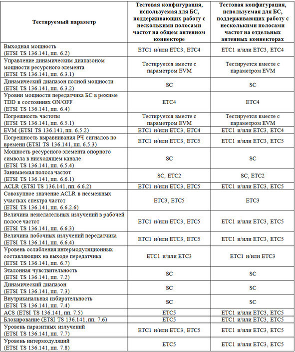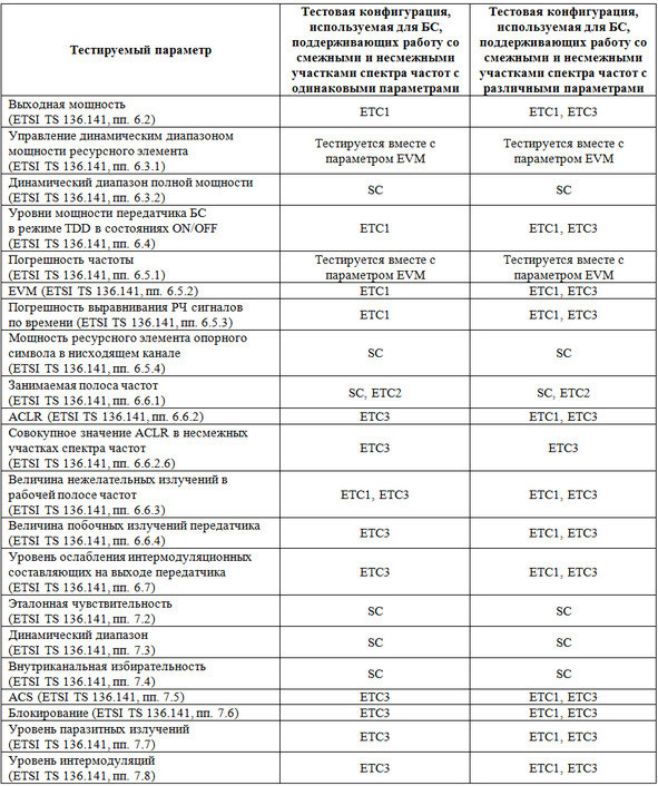 Перед проведением тестирования любого параметра требуется задать режим работы базовой станции с одной несущей (SC, Single Carrier) или несколькими (MC, Multi – Carrier). Режим работы с несколькими несущими делится на режимы с использованием функции объединения несущих (особенности нумерации рабочих полос частот при объединении несущих приведены в пп. 5.5 спецификации ETSI TS 136.141) и без такового. Режим работы с несколькими несущими предусматривает необходимость выбора соответствующей тестовой конфигурации (ETC, E-UTRA Test Configuration). Выбор тестовой конфигурации должен производиться, исходя из определения в соответствии с пп. 4.6.8 спецификации ETSI TS 136.141 поддерживаемых радиочастотных конфигураций. В пп. 4.10 указанной спецификации определено 5 тестовых конфигураций для режимов работы с несколькими несущими и/или с использованием функции объединения несущих. ETC1 применяется при работе со смежными участками спектра частот при проведении тестирования всех параметров радиооборудования базовых станций без использования функции объединения несущих. При тестировании параметров приемников с использованием ETC1, необходимо для каждой поддерживаемой рабочей полосы частот обеспечить генерацию тестовым оборудованием двух крайних несущих в рабочем спектре частот. ETC2 применяется при работе со смежными участками спектра частот при проведении тестирования с использованием функции объединения несущих. ETC3 применяется при работе с несмежными участками спектра частот при проведении тестирования всех параметров радиооборудования базовых станций без использования функции объединения несущих. При тестировании параметров приемников с использованием ETC3, необходимо для каждого поддерживаемого частотного подблока обеспечить генерацию тестовым оборудованием двух крайних несущих в рабочем спектре частот. ETC4 применяется при работе с несколькими полосами частот для проверки аспектов эксплуатации, связанных с использованием максимального поддерживаемого числа несущих. ETC5 применяется при работе с несколькими полосами частот для проверки аспектов эксплуатации, связанных с использованием сокращенного числа несущих при высокой спектральной плотности мощности на несущую (PSD, Power Spectral Density). Методика сборки и рекомендации по настройке каждой тестовой конфигурации соответственно приведены в пп. 4.10 спецификации ETSI TS 136.141. Применимость тестовых конфигураций для тестирования параметров радиооборудования базовых станций описана в таблицах 2.1, 2.2 и 2.3.
