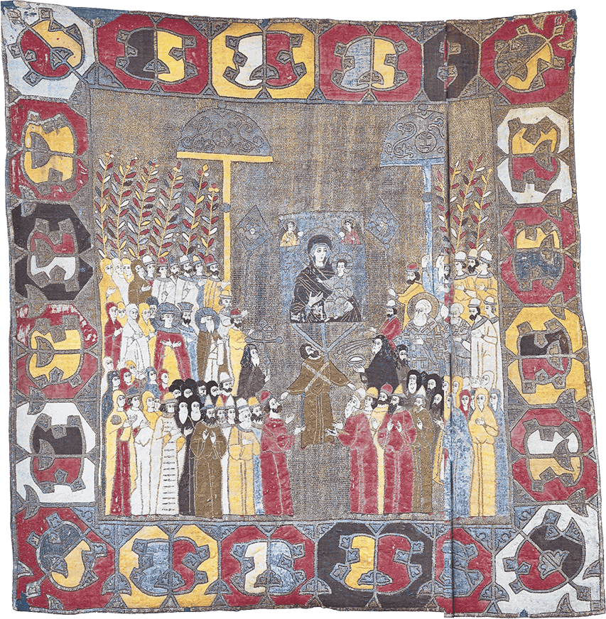 Одна из первых светских «картин» Древней Руси – пелена «Вынос иконы „Богоматерь Одигитрия“». Около 1498 г.