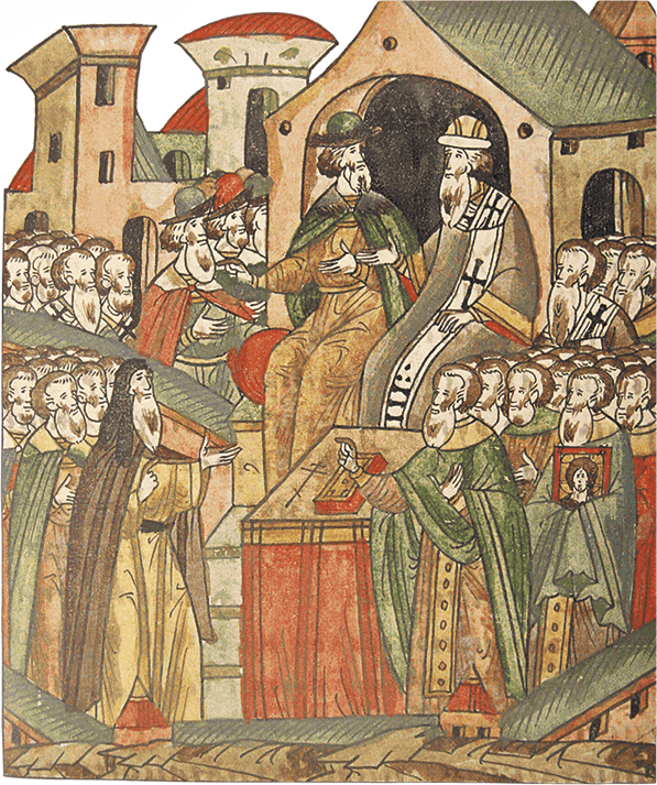 Церковный собор. Миниатюра Лицевого летописного свода. XVI в.