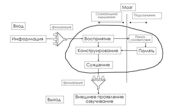 Пройденная через фильтрующего «швейцара» информация воспринимается и находится некоторое время в кратковременной памяти. Мозг вновь поступившую информацию сопоставляет с информацией, которая есть у нас в долговременной памяти, перерабатывает и возвращает в сознательную область уже в видоизмененном состоянии. Далее формируется некое суждение, решение, умозаключение. Это суждение либо озвучивается (слово — серебро), либо придерживается на потом (молчание — золото).