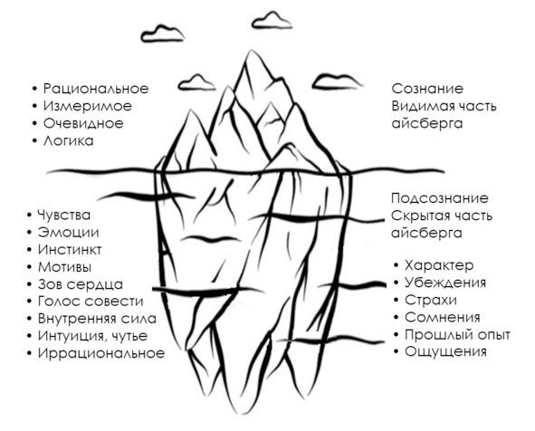 Можно сознание и подсознание представить себе как айсберг[11]: надводная часть — это сознание, подводная — подсознание. Надводная часть относительно небольшая, включает рациональное, измеримое, очевидное, т. е. то, что осознано. Есть скрытая подводная часть, относительно большая. Весь наш опыт, наши знания и навыки находятся здесь: иррациональное, эмоциональное, чувства, интуиция, чутье, инстинкт, мотивы, внутренний голос, совесть, зов сердца в конце концов. Всё это в совокупности формирует характер, убеждения, страхи, сомнения, прошлый опыт, ощущения. Это весь человек по сути дела. Мы на виду только частично, большая же часть скрыта, причем скрыта даже от нас самих, от нашей сознательной деятельности.