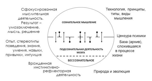 Акцентирую внимание на том, что мыслительная деятельность может осуществляться не только на сознательном уровне, но и на уровне подсознания. Осознанное мышление человек использует для решения целевых задач, в этом случае мышление осуществляется с привлечением спрятанных в подсознании данных, стереотипов и шаблонов.