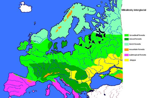 Paleogeographers, soil scientists, paleoclimatologists came to the conclusion that «130—70 thousand years ago the conditions typical for the western Atlantic regions of Europe were distributed to Eastern Europe. The differences in the climate of Western Europe today and the Mikulinsk interglacial, in contrast from Eastern Europe, were small.»