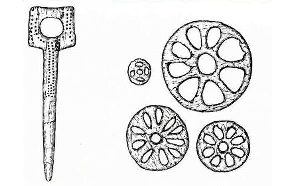 Cultural traditions prevailing among the population of the northern part of the Russian Plain of that distant time, very well represented by the graves of the Sungir site near the city of Vladimir, dating to the end of the Molozhsko-Sheksninsk time. Here, observing a long-established ritual, people who lived in the 24th millennium BC, before burying their dead, sprinkled the bottom of the grave with hot coals, cleansing it, possibly with the remnants of trizny. Then chalk or another white substance, similar to lime, was strewn to the bottom, and already over a white layer, densely sprinkled with red ocher. White and red — the symbols of purity and blood, snow and fire were already at that distant time, escorting a person to another world. The deceased were put into the grave in richly decorated clothes, with numerous stone and bone tools and weapons; they were covered with fur cloaks and plentifully covered with red ocher. So in Sungir in one of the graves was buried a tall, broad-shouldered man 55—56 years old, lying on his back with his hands folded on his stomach, his head was turned to the northeast. He was wearing a suede or fur shirt, leather pants and leather shoes such as moccasins. All the clothes of this man are 24 millennia BC. It was embroidered with 3,500 beads carved from mammoth tusks. On his hands he wore more than 20 bracelets from thin, cut from mammoth tusks, plates, as well as bracelets from strung beads. The entire headdress was embroidered with beads and ended at the back of the head with arctic fangs. On the man’s shoulders lay a short fur cloak embroidered with larger beads. A girl of 7—8 years old and a boy of 12—13 years old were buried next to the man. Their burials were also accompanied by a huge number of mammoth bone products. Of particular interest are spears made from split and straightened tusks: 2 m. 42 cm in the boy and 1 m. 66 cm in the girl. Today it is not yet clear how our distant ancestors straightened and split the three-meter tusks, how long, straight; hard and sharp spears were trimmed. Children’s clothes were embroidered with beads even richer than the clothes of men. A total of about 7,500 beads were sewn on it, children wore bracelets, and mammoth bone rings. In addition, the clothes were decorated with elegant ornamented slotted discs, hair clips, fasteners.