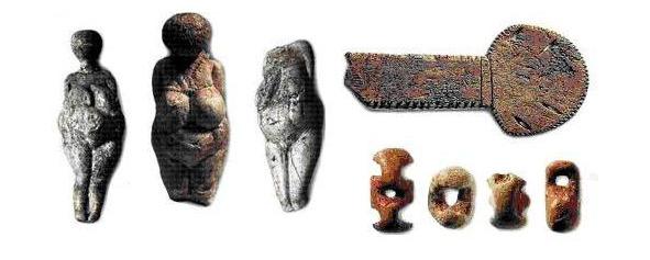 Abstract human thinking of the Upper Paleolithic of Eastern Europe was significantly developed, as evidenced not only by the burial of Sungiri, but also numerous ornamented crafts of that distant time, being highly exemplary Paleolithic art. So on the Don (Kostenki) on bone and flint products — female figures — as a rule, graphic depicted ribbon bands on the chest and waist. Of the elements of the ornament, an oblique cross is most often found. M. D. Gvozdover writes: «Obviously, this ornament should be considered the most characteristic of the Kostenkov culture, moreover, in other Paleolithic cultures, the rows of oblique crosses are almost unknown… The choice of ornament and its location on the subject is not caused by technological reasons or material… the nature of the arrangement of the elements of the ornament and their choice are caused not by technological reasons, but by cultural tradition… archaeological culture is characterized by both the elements of the ornament themselves and the type of their location on the ornamental field and the grouping of elements.»